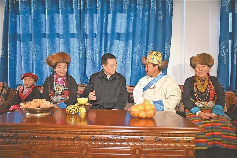 12月2日至3日,自治区党委书记王君正在日喀则市萨迦县、拉孜县调研,宣讲党的二十届四中全会精神和自治区党委十届九次全会精神。这是王君正在萨迦县查荣乡江雄村村民次平家中亲切交谈。本报记者 旦增西旦 摄
